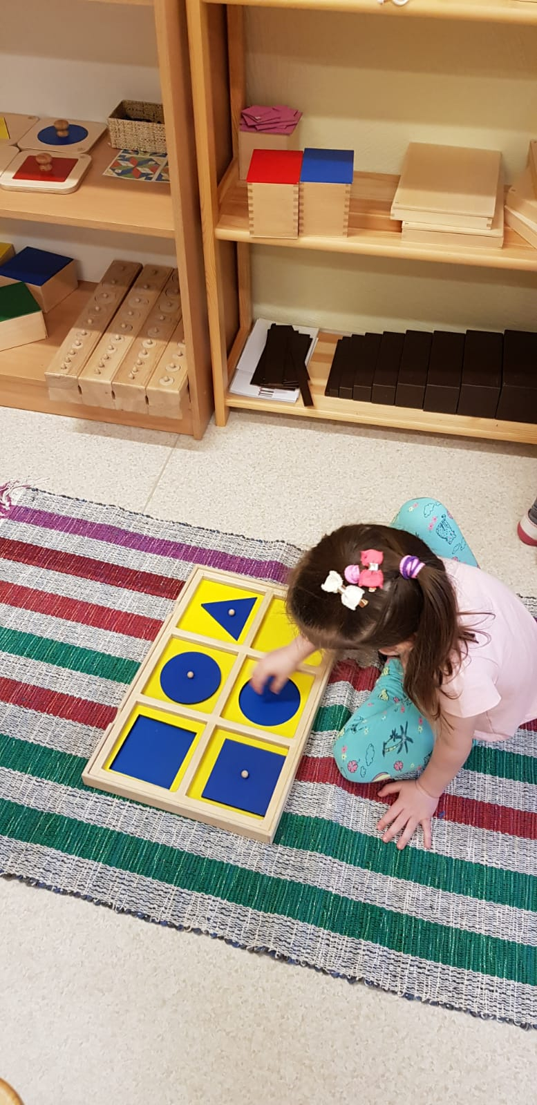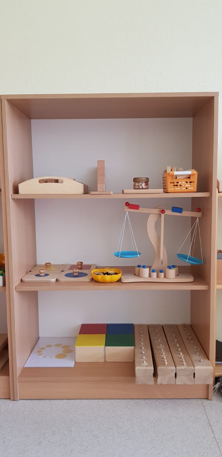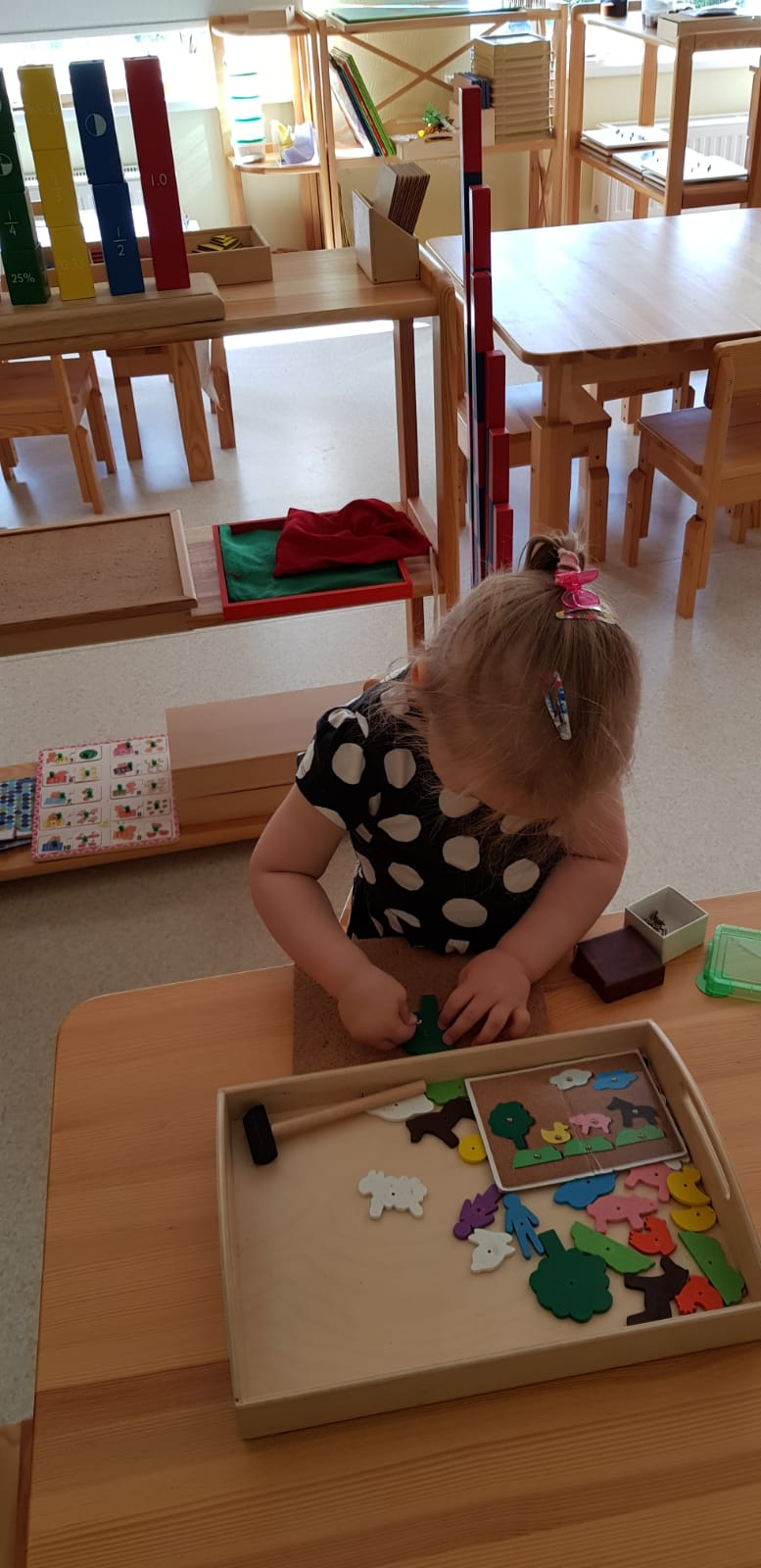 Skolotāja uzdevums ir parādīt bērnam, kā ar materiālu strādāt, sniegt atbalstu, ja tas nepieciešams, bet nedarīt bērna vietā. Bērns labāk atceras tad, ja ir ne tikai redzējis vai dzirdējis, bet ir izdzīvojis ar visām maņām un paveicis pats. Montesori materiāls nav uzskates līdzeklis, tā būtība ir tajā, ka visu var ņemt rokās, pētīt, darboties. Bet ir jāievēro, ka katrs materiāls ir paredzēts savam uzdevumam un pēc darbošanās tas jānoliek atpakaļ tam paredzētajā vietā.Montesori didaktiskais materiāls ir veidots tā, lai tas organiski saplūstu ar bērna spējām un interesēm, kā arī tādā secībā, lai bērns justu tieksmi nepārtraukti izzināt vēl nezināmo. Darbošanās norit nepiespiesti, ar aizrautību un interesi, jo bērni izjūt iekšēju nepieciešamību darīt to, ko viņi paši izvēlas.